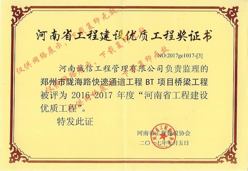 2016-2017年度河南省工程建設優質工程鄭州市隴海路快速通道工程