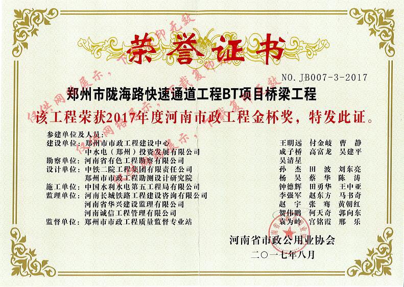 2017年度河南省市政工程金杯獎鄭州市隴海路快速通道工程BT項目橋梁工程