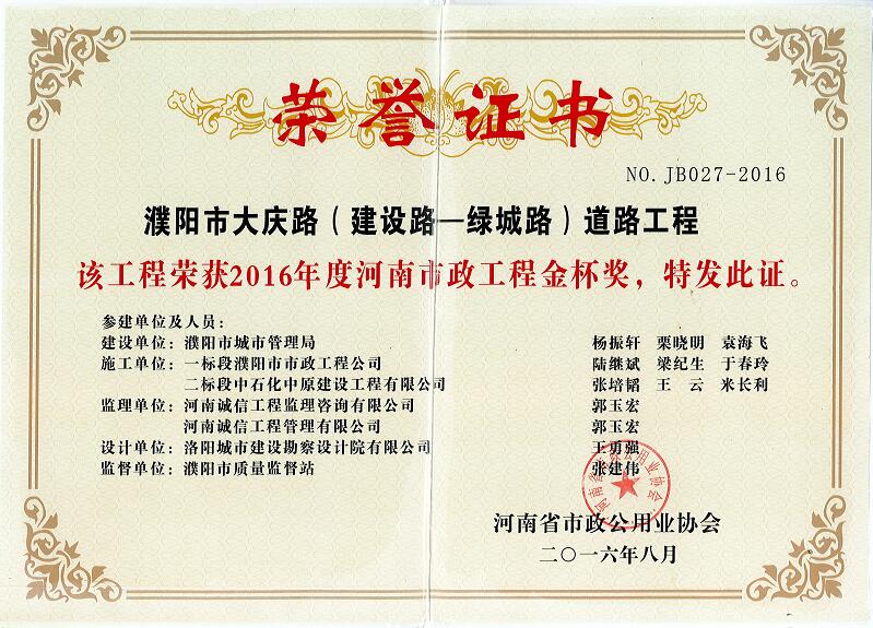2016年度河南省市政工程金杯獎濮陽市大慶路道路工程