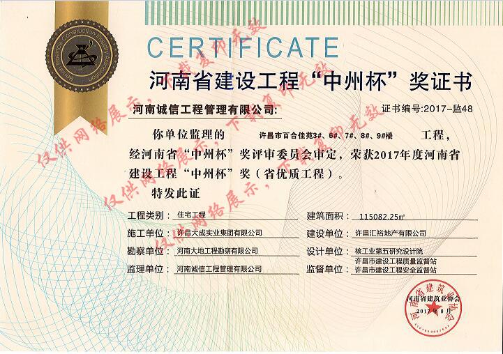 煜泰山禹城工程被評為“河南省結構中州杯”2016年