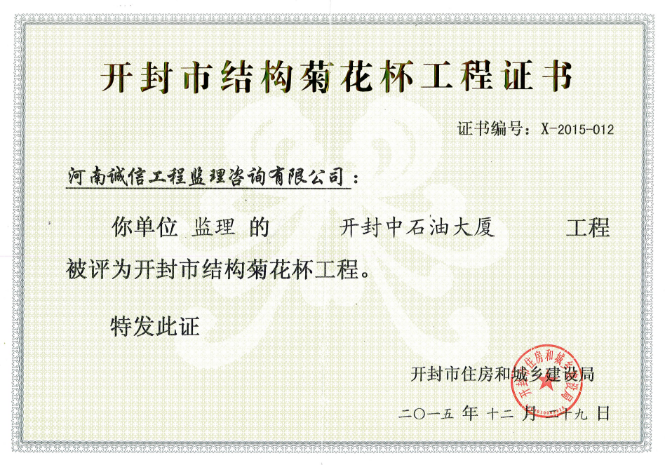 2015年開封中石油大廈工程被評為開封市機構菊花杯工程